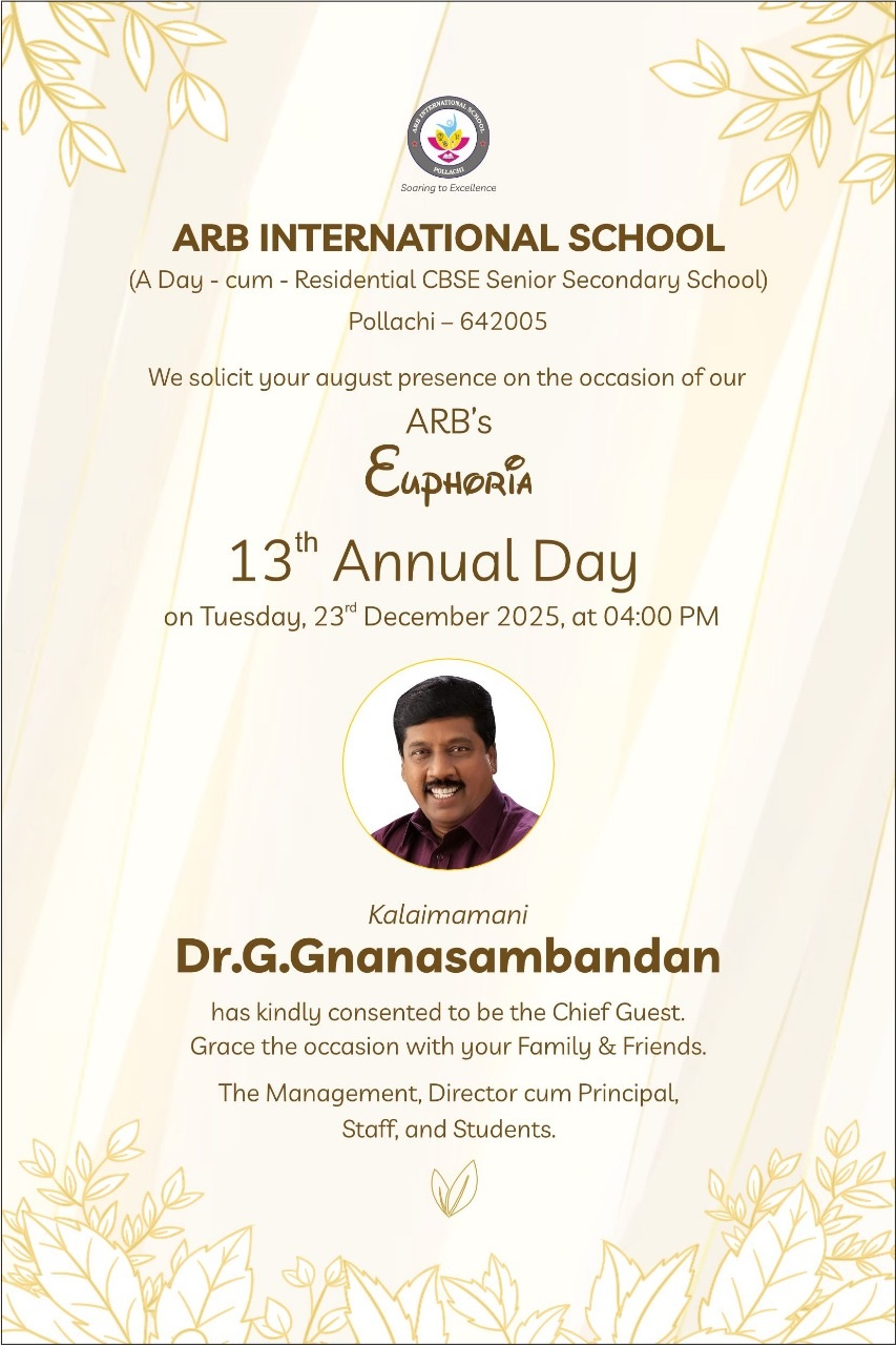 ARB International School celebrated its Annual Day on 23 December 2025 at the School Assembly Ground with great enthusiasm. The event was graced by Chairman Shri R. Subramaniam, Secretary Shri P. Tamil Selvan, Managing Trustees Mrs. Maheshwari Subramaniam and Smt. Thangamani Tamil Selvan, along with Chief Guest. The programme featured a ceremonial band escort, lamp lighting, prize distribution, cultural performances and highlights of academic achievements. The Chief Guest, Dr. G. Gnana Sambandan, renowned Indian professor, Tamil scholar, orator and acclaimed Tamil film actor, inspired the gathering with his address. Referring to the age-old saying “Matha, Pitha, Guru, Deivam,” the Chief Guest highlighted the vital role teachers play in shaping the character and values of a child. The celebration concluded on a patriotic note with the National Anthem, marking the event as a grand success.